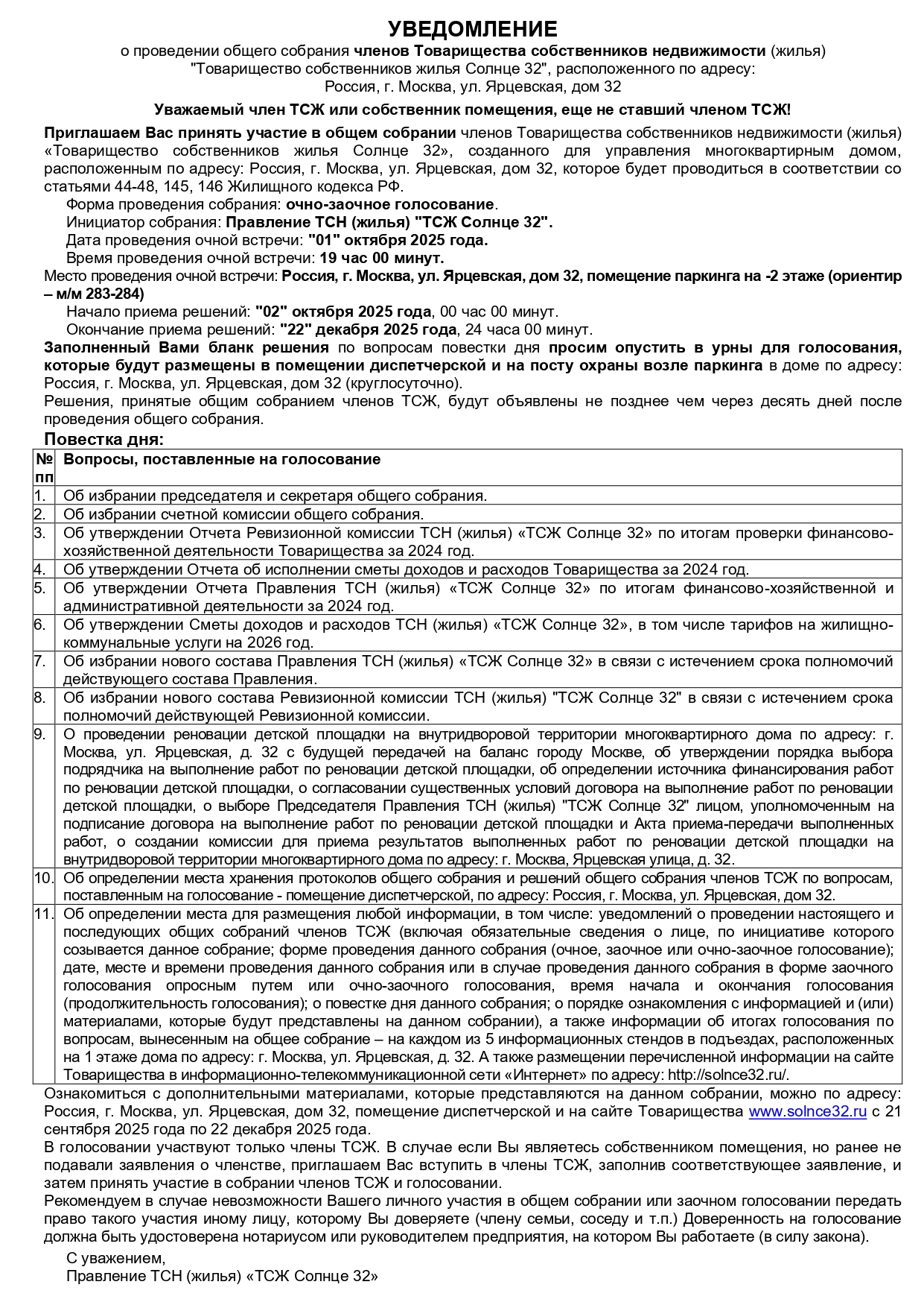 1 октября 2025 года состоится Общее собрание членов Товарищества (ОСЧ)